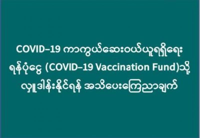 ၁။ ကိုဗစ်-၁၉ ကာကွယ်ဆေးဝယ်ယူနိုင်ရေးအတွက် ကိုဗစ်-၁၉ ကာကွယ်ဆေးဝယ်ယူရရှိရေး ရန်ပုံငွေ (CoVID-19 Vaccination Fund)ကို မြန်မာ့စီးပွားရေးဘဏ်(နေပြည်တော်)တွင် အောက်ပါအတိုင်း ဖွင့်လှစ်ထားပါသည်-