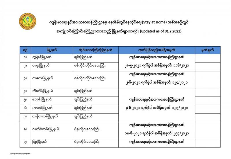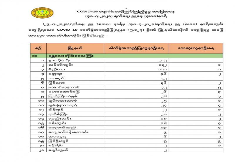 (၂၉-၇-၂၀၂၁)ရက်နေ့၊ ည (၈:၀၀) နာရီမှ (၃၀-၇-၂၀၂၁)ရက်နေ့၊ ည (၈:၀၀) နာရီအတွင်း တွေ့ရှိရသော COVID-19 ဓာတ်ခွဲအတည်ပြုလူနာ (၅,၁၂၇) ဦး၏ မြို့နယ်အလိုက် တွေ့ရှိရမှု အခြေ အနေမှာ အောက်ပါအတိုင်း ဖြစ်ပါသည် -