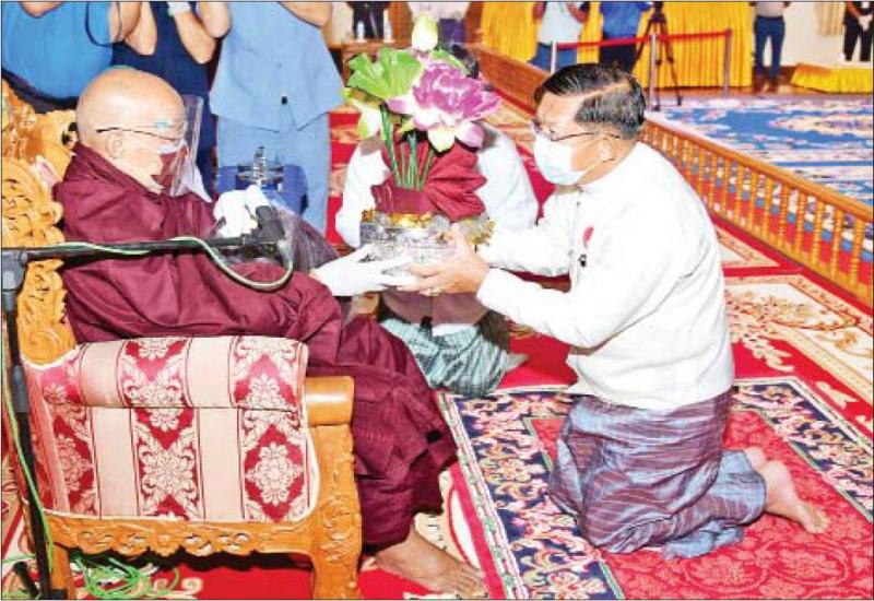 ပြည်ထောင်စုသမ္မတမြန်မာနိုင်ငံတော်၊ နိုင်ငံတော်စီမံအုပ်ချုပ်ရေးကောင်စီ၏ ၂၀၂၁ ခုနှစ်၊ ဝါဆိုသင်္ကန်းဆက်ကပ်လှူဒါန်းပွဲ မင်္ဂလာအခမ်းအနားကို ယနေ့နံနက်ပိုင်း တွင် နေပြည်တော် ကောင်စီနယ်မြေ၊ ဥပ္ပါတသန္တိစေတီတော်မြတ်ကြီးပရိဝုဏ်တော် အတွင်းရှိ သာသနာ့မဟာ ဗိမာန်တော်ကြီး၌ ကျင်းပပြုလုပ်ရာ နိုင်ငံတော်စီမံအုပ်ချုပ်ရေး ကောင်စီဥက္ကဋ္ဌ တပ်မတော် ကာကွယ်ရေးဦးစီးချုပ် ဗိုလ်ချုပ်မှူးကြီး မင်းအောင်လှိုင် က ဝါဆိုသင်္ကန်း၊ လှူဖွယ်ပစ္စည်း များနှင့် ဆွမ်း၊ ခဲဖွယ်၊ ဘောဇဉ် တို့ကို ဆက်ကပ်လှူဒါန်း သည်။