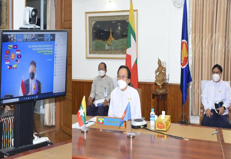 ကျန်းမာရေးနှင့် အားကစားဝန်ကြီးဌာန ပြည်ထောင်စုဝန်ကြီး ဒေါက်တာ သက်ခိုင်ဝင်းသည် ယနေ့နံနက်ပိုင်းတွင် တစ်နှစ်အကြာ ကိုဗစ်-၁၉ ရောဂါ တုံ့ပြန်ရေး ၂၀၂၁ အထူးဗီဒီယို ကွန်ဖရင့် Special VIDEO Conference of the 2021 ASEAN Health Ministers on “ASEAN COVID-19 Response after One Year” ကို ကျန်းမာရေးနှင့် အားကစားဝန်ကြီးဌာန ပြည်ထောင်စုဝန်ကြီး ဧည့်ခန်းမမှ တက်ရောက်ဆွေးနွေးသည်။