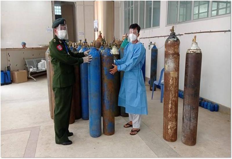 ကိုဗစ်-၁၉ ရောဂါဓာတ်ခွဲအတည်ပြု ပိုးတွေ့လူနာများနှင့် သီးသန့်စောင့် ကြည့်ရမည့်သူများကို ကုသရေးလုပ်ငန်းများ ဆောင်ရွက်ရာတွင် အောက်ဆီဂျင် လိုအပ်ချက်များကို တစ်ဖက်တစ်လမ်းမှ အထောက်အကူပြုစေရန်အတွက် တပ်မတော် နှင့် အလှူရှင်များက အောက်ဆီဂျင်အိုးများကို တိုင်းဒေသကြီးနှင့် ပြည်နယ်အသီးသီးရှိ ပြည်သူ့ဆေးရုံများ၊ တပ်မတော်ဆေးရုံများ၊ ကျန်းမာရေးဌာနများနှင့် ကိုဗစ်စင်တာ များသို့ ပေးပို့လှူဒါန်းလျက်ရှိသည်။