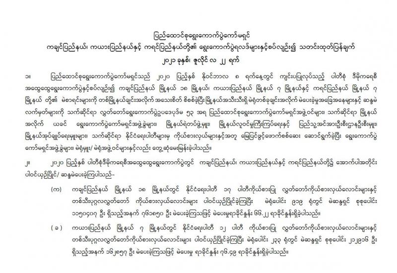 နိုင်ငံတော်အတွင်း၌ ကိုဗစ်-၁၉ ကာကွယ်၊ ထိန်းချုပ်၊ ကုသရေးလုပ်ငန်းများအတွက် အရေးတကြီး လိုအပ်လျက်ရှိသည့် အောက်ဆီဂျင်၊ ဆေးဝါးနှင့် ဆက်စပ်ပစ္စည်းများ ပြတ်လပ်မှုမရှိစေဘဲ အမြန်ဆုံးရောက်ရှိ နိုင်ရေးအတွက် အပြည်ပြည်ဆိုင်ရာ လေဆိပ်၊ ပင်လယ်ရေကြောင်းဆိပ်ကမ်းများနှင့် နယ်စပ်ကုန်သွယ်ရေးစခန်းများမှ အဆက်မပြတ် တင်သွင်း ခွင့်ပြုလျက်ရှိသည်။