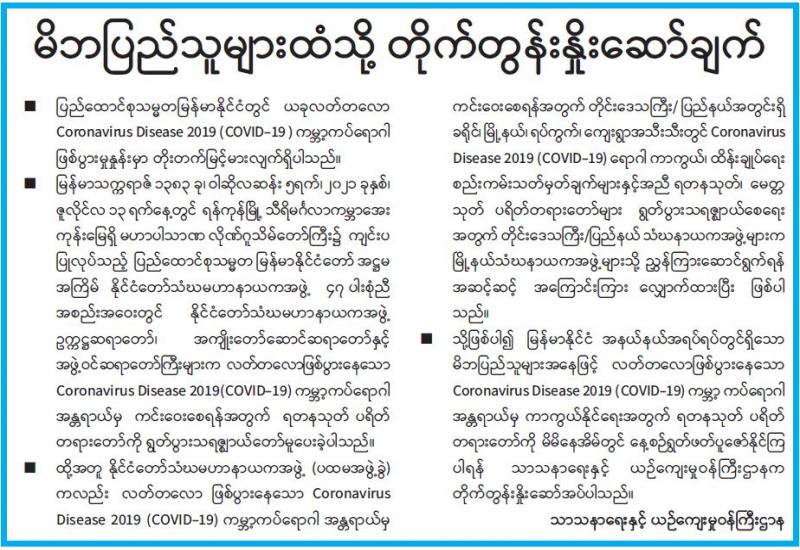 ကိုဗစ်-၁၉ ရောဂါ တတိယလှိုင်း ဖြစ်ပွားလျက်ရှိပြီး ရောဂါကူးစက်ပြန့်ပွားမှုမှာ နေ့စဉ်မြင့်တက်လျက်ရှိသောကြောင့် ရောဂါကူးစက်မှုမခံရစေရေးအတွက် နေပြည်တော်ကောင်စီ နယ်မြေ၊ ရှမ်းပြည်နယ်(မြောက်ပိုင်း)၊ လားရှိုးမြို့၊ ဧရာဝတီတိုင်းဒေသကြီး၊ ပုသိမ်မြို့နှင့် ပဲခူးတိုင်းဒေသကြီး၊ တောင်ငူမြို့များ၌