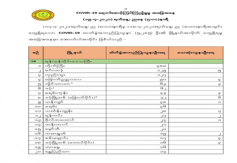 (၁၇-၇-၂၀၂၁)ရက်နေ့၊ ည (၈:၀၀)နာရီမှ (၁၈-၇-၂၀၂၁)ရက်နေ့၊ ည (၈:၀၀)နာရီအတွင်း တွေ့ရှိရသော COVID-19 ဓာတ်ခွဲအတည်ပြုလူနာ (၅,၂၈၅) ဦး၏ မြို့နယ်အလိုက် တွေ့ရှိရမှု အခြေအနေမှာ အောက်ပါအတိုင်း ဖြစ်ပါသည် - #Ministry_Of_Health_and_Sports_Myanmar