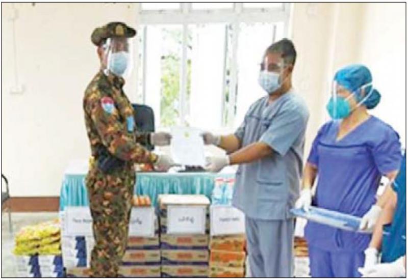 လက်ရှိအချိန်တွင် ကိုဗစ်-၁၉ ရောဂါ တတိယလှိုင်းဖြစ်ပွားမှု မြင့်တက်လျက်ရှိပြီး ဓာတ်ခွဲအတည်ပြု ပိုးတွေ့လူနာများနှင့် သီးသန့်စောင့်ကြည့်ရမည့်သူများကို တပ်မတော်ဆေးရုံများ၊ ပြည်သူ့ဆေးရုံများ၊ ကျန်းမာရေးဌာနများနှင့် ကိုဗစ်စင်တာများတွင် ကျန်းမာရေးစောင့်ရှောက်မှု လုပ်ငန်းများကို တပ်မတော်သား ဆရာဝန်များ၊ ကျန်းမာရေးဝန်ထမ်းများ၊ လူမှုရေးအသင်းအဖွဲ့များ ပူးပေါင်း၍ အင်တိုက်အားတိုက် ဆောင်ရွက်ပေးလျက်ရှိပြီး ထိုသို့ဆောင်ရွက်ပေးရာတွင် အထောက်အကူဖြစ်စေရန် အတွက် ကာကွယ်၊ ထိန်းချုပ်၊ ကုသရေးပစ္စည်းများ၊ အောက်ဆီဂျင်အိုးများနှင့် အာဟာရဖြည့် စားသောက်ဖွယ်ရာများကို တပ်မတော်က သွားရောက်ထောက်ပံ့လှူဒါန်းပေးလျက်ရှိသည်။