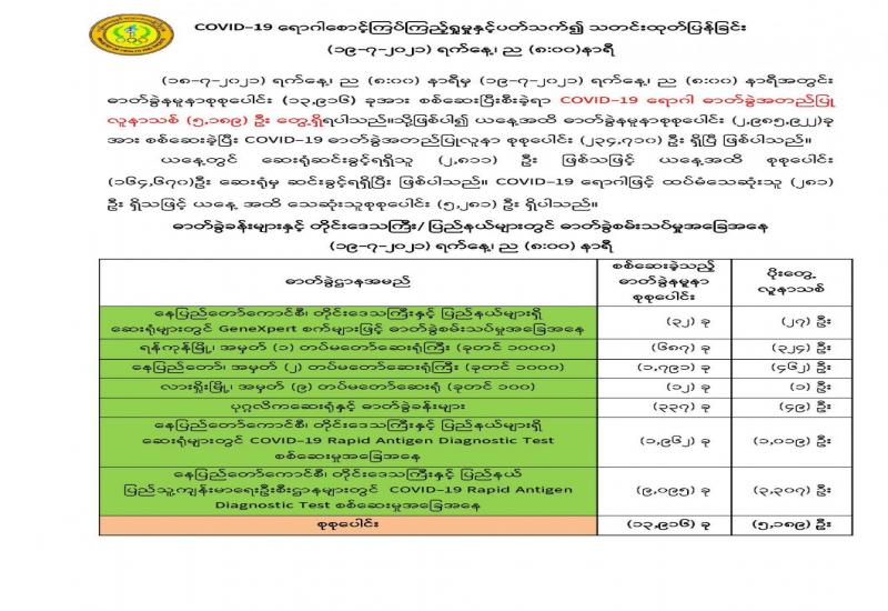 ကိုဗစ်-၁၉ ရောဂါ ကာကွယ်၊ ထိန်းချုပ်၊ ကုသရေး စီမံဆောင်ရွက်ထားမှုများနှင့် ပတ်သက်၍ “Positive လူနာတွေနဲ့ပတ်သက်ပြီး နေရာပေါင်း ၁၁၁၄ နေရာမှာ -၄၅၉၀၀၊ ၄၆၀၀၀ ခန့်ဝင်ဆံ့တဲ့ အင်အားရှိပါတယ်။ လောလောဆယ် ၆၂ ရာခိုင်နှုန်းပဲ Positive လူနာထားတဲ့နေရာမှာရှိပါတယ်။ ကုသရေး Center ပေါင်း ၅၆၀ လောက် လုပ်ထားတဲ့နေရာမှာ ဝင်ဆံ့တာက ၂၅၅၀၀ ခန့်ရှိပါတယ်။
