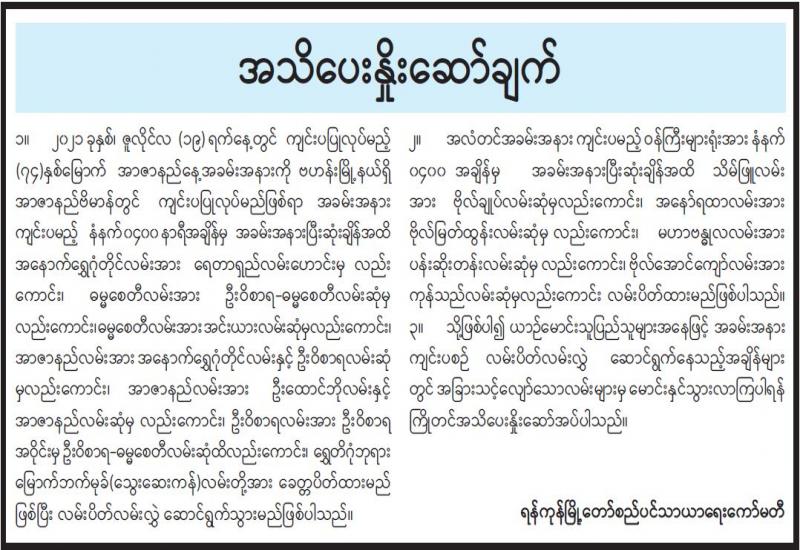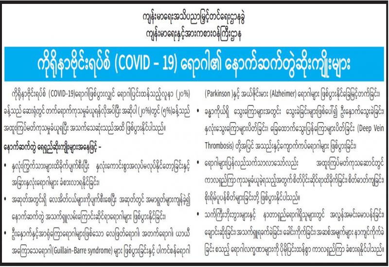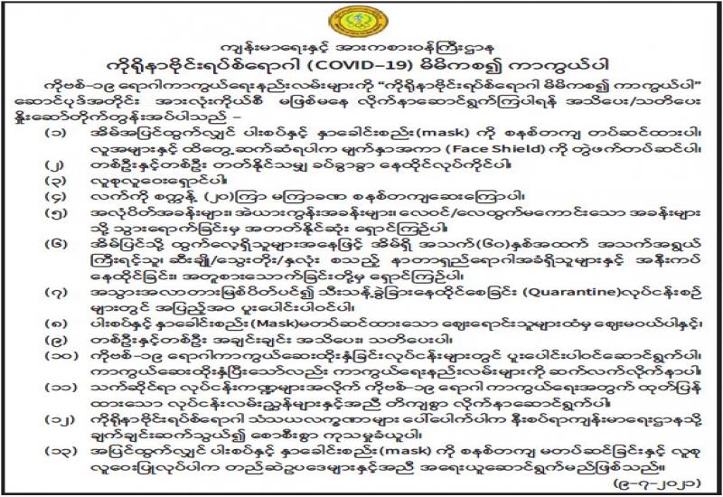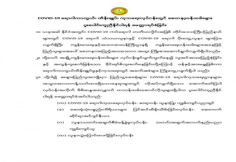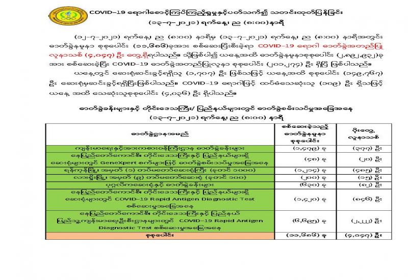 ၁။ ယခုအခါ နိုင်ငံအတွင်း COVID-19 ကပ်ရောဂါ တတိယလှိုင်းအဖြစ် တိုင်းဒေသကြီး/ပြည်နယ် များတွင် COVID-19 ရောဂါ သံသယလူနာနှင့် COVID-19 ရောဂါ ပိုးတွေ့လူနာ များပြား လျက်ရှိပြီး ကျန်းမာရေးနှင့် အားကစား ဝန်ကြီးဌာနရှိ ကျန်းမာရေးဝန်ထမ်းများအနေဖြင့် ပြည်သူများအပေါ် စေတနာအပြည့်အဝထားကာ အထူး ကြိုးစား ဆောင်ရွက်လျက်ရှိပါသည်။