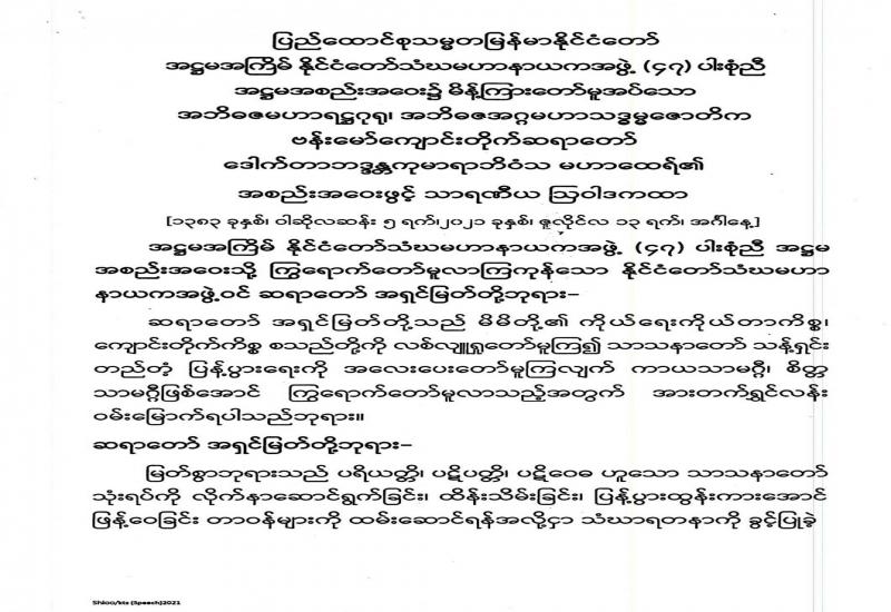 ပြည်ထောင်စုသမ္မတမြန်မာနိုင်ငံတော် အဋ္ဌမအကြိမ် နိုင်ငံတော်သံဃမဟာနာယက အဖွဲ့ (၄၇) ပါးစုံညီ အဋ္ဌမအစည်းအဝေးကို ယနေ့နံနက် ၈ နာရီတွင် ရန်ကုန်မြို့၊ သီရိမင်္ဂလာ ကမ္ဘာအေး ကုန်းမြေရှိ မဟာပါသာဏလိုဏ်ဂူသိမ်တော်ကြီး၌ ကျင်းပသည်။