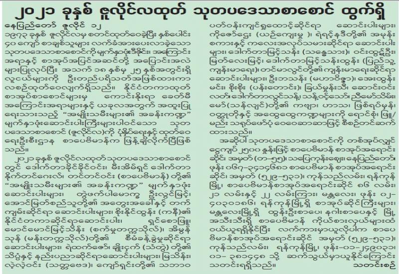 ပြည်ထောင်စုသမ္မတမြန်မာနိုင်ငံတော်၊ သာသနာရေးနှင့် ယဉ်ကျေးမှုဝန်ကြီးဌာန၊ သာသနာရေးဦးစီးဌာနက ကျင်းပပြီးစီးခဲ့သော ၁၃၈၃ (၂၀၂၁) ခုနှစ်၊ ဓမ္မာစရိယစာမေးပွဲတွင် သံဃာတော်များ၊ သာသနာ့နွယ်ဝင်သီလရှင်များနှင့် လူပုဂ္ဂိုလ်များ ဝင်ရောက်ဖြေဆိုကြရာ ဓမ္မာစရိယ၊ သုံးကျမ်းအောင် (ကျမ်းပြီး) (၅၉၇)ပါး၊ နှစ်ကျမ်းအောင် (၇၀၂) ပါး၊ တစ်ကျမ်းအောင် (၁၄၄၂) ပါး၊ ပါဠိဂုဏ်ထူးအောင် (၁) ပါး၊ မြန်မာဂုဏ်ထူးအောင် (၆)ပါး၊ စုစုပေါင်း (၂၇၄၈)ပါး အောင်မြင်တော်မူကြပါသည်။