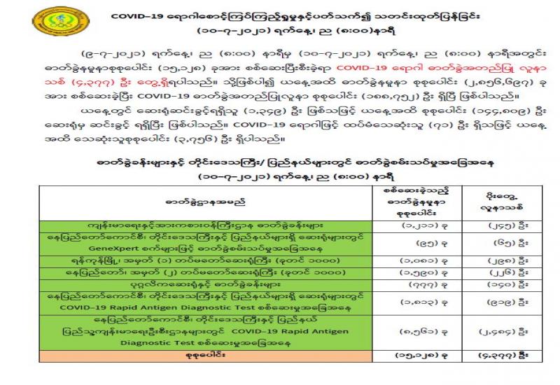 (၁၀-၇-၂၀၂၁) ရက်နေ့၊ ည (၈:၀၀) နာရီမှ (၁၁-၇-၂၀၂၁) ရက်နေ့၊ ည (၈:၀၀) နာရီအတွင်း ဓာတ်ခွဲနမူနာစုစုပေါင်း (၁၀,၁၁၇) ခုအား စစ်ဆေးပြီးစီးခဲ့ရာ COVID-19 ရောဂါ ဓာတ်ခွဲအတည်ပြု လူနာ သစ် (၃,၄၆၁) ဦး တွေ့ရှိရပါသည်။ သို့ဖြစ်ပါ၍ ယနေ့အထိ ဓာတ်ခွဲနမူနာ စုစုပေါင်း (၂,၈၆၆,၈၁၄) ခု အား စစ်ဆေးခဲ့ပြီး COVID-19 ဓာတ်ခွဲအတည်ပြုလူနာ စုစုပေါင်း (၁၉၂,၂၁၃) ဦး ရှိပြီ ဖြစ်ပါသည်။