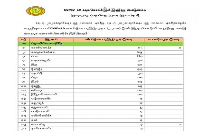 (၃-၇-၂၀၂၁)ရက်နေ့၊ ည (၈:၀၀) နာရီမှ (၄-၇-၂၀၂၁)ရက်နေ့၊ ည (၈:၀၀) နာရီအတွင်း တွေ့ရှိရသော COVID-19 ဓာတ်ခွဲအတည်ပြုလူနာ (၂,၃၁၈) ဦး၏ မြို့နယ်အလိုက် တွေ့ရှိရမှု အခြေ အနေမှာ အောက်ပါအတိုင်း ဖြစ်ပါသည် -