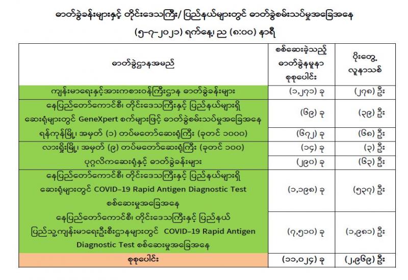 (၄-၇-၂၀၂၁) ရက်နေ့၊ ည (၈:၀၀) နာရီမှ (၅-၇-၂၀၂၁) ရက်နေ့၊ ည (၈:၀၀) နာရီအတွင်း ဓာတ်ခွဲနမူနာစုစုပေါင်း (၁၁,၀၂၄) ခုအား စစ်ဆေးပြီးစီးခဲ့ရာ COVID-19 ရောဂါ ဓာတ်ခွဲ အတည်ပြု လူနာသစ် (၂,၉၆၉) ဦး တွေ့ရှိရပါသည်။ သို့ဖြစ်ပါ၍ ယနေ့အထိ ဓာတ်ခွဲနမူနာ စုစုပေါင်း (၂,၇၈၃,၃၈၅)ခု အား စစ်ဆေးခဲ့ပြီး COVID-19 ဓာတ်ခွဲအတည်ပြုလူနာ စုစုပေါင်း (၁၆၈,၃၇၄) ဦးရှိပြီ ဖြစ်ပါသည်။