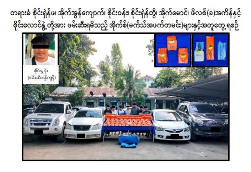 ရှမ်းပြည်နယ်(အရှေ့ပိုင်း)၊ တာချီလိတ်မြို့နယ်၊ ဖန်မင်ကျေးရွာအုပ်စု၊ မယ်ယန်းကျေးရွာ၌ အောက်တိုဘာ ၄ ရက်တွင်အိုက်စ် (မက်သ်အဖက်တမင်း) ၂၀၇ ကီလို (ခန့်မှန်းတန်ဖိုးငွေကျပ် ၁ ဒသမ ၆၅၆ ဘီလီယံခန့်) ဖမ်းဆီးရမိခဲ့ကြောင်း မြန်မာနိုင်ငံရဲတပ်ဖွဲ့မှသိရှိရသည်။