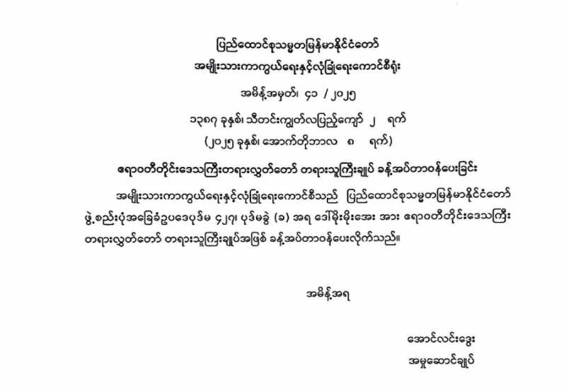 ရန်ကုန်မြို့နှင့် မန္တလေးမြို့အတွက် ရည်ညွှန်းလက်ကားဈေးနှုန်းများနှင့် ပြည်ထောင်စုနယ်မြေ နေပြည်တော်၊ တိုင်းဒေသကြီး/ပြည်နယ် မြို့တော်များအတွက် ရည်ညွှန်းလက်လီဈေးနှုန်းများ