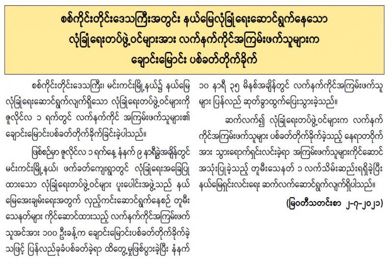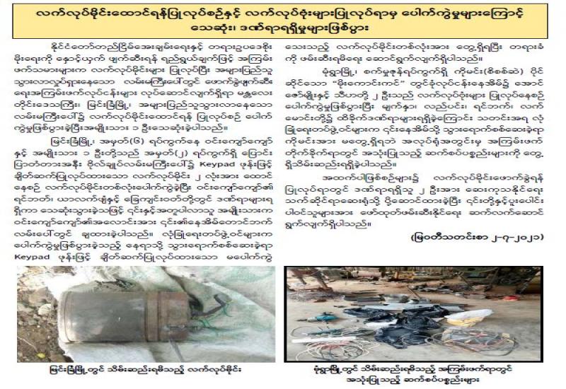 နိုင်ငံတော်တည်ငြိမ်အေးချမ်းမှုကို ပျက်ပြားထိခိုက်စေရန် ရည်ရွယ်၍ လူငယ်များအား တိုင်းရင်းသားလက်နက်ကိုင်အဖွဲ့များထံတွင် အကြမ်းဖက်သင်တန်းများ တက်ရောက်စေပြီး အများပြည်သူလူထု သွားလာလှုပ်ရှားလျက်ရှိသည့် နေရာများကို မိုင်းထောင်တိုက်ခိုက်ခြင်း၊ ကလေးသူငယ်များ၏ ပညာရေးကို ထိခိုက်စေရန် စာသင်ကျောင်းများအား မီးရှို့ဖျက်ဆီးခြင်း၊ မိုင်းထောင်တိုက်ခိုက်ခြင်းများကို လူသားချင်းစာနာ ထောက်ထားမှုမရှိဘဲ လုပ်ဆောင်လျက်ရှိသည်။