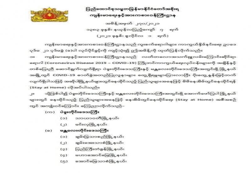 ကိုဗစ်-၁၉ ရောဂါဗစ်-၁၉ ရောဂါကူးစက်နေသည်ကို သတိပြုယခုအခါတွင် ကိုဗစ်-၁၉ ရောဂါ ကူးစက်ပြန့်ပွားမှုမှာ ကမ္ဘာနှင့်တစ်ဝန်း မြင့်မား လာနေပြီး မြန်မာနိုင်ငံတွင်လည်း ကိုဗစ်-၁၉ ရောဂါကူးစက်မှုသည် တစ်နေ့ထက်တစ်နေ့ တိုးတက်ဖြစ်ပေါ်နေရာ ရောဂါကူးစက် ပြန့်ပွားမှုရှိနေသည်ကို သတိပြုရမည်ဖြစ်သည်။ ကိုဗစ်-၁၉ ရောဂါ ကူးစက်ပြန့်ပွားမှု မြင့်မားနေသော မြို့နယ်များ အား နေအိမ်တွင်နေထိုင်ရေး (Stay at Home) အစီအစဉ်များကို ကျန်းမာရေးနှင့် အားကစားဝန်ကြီးဌာနက ထုတ်ပြန်ထားသော အမိန့်၊ ညွှန်ကြားချက်၊ လုပ်ငန်းစဉ် များနှင့်အညီ ပြည်သူများအနေဖြင့် အတိအကျလိုက်နာဆောင်ရွက်ကြရန် လိုအပ် ပေသည်။