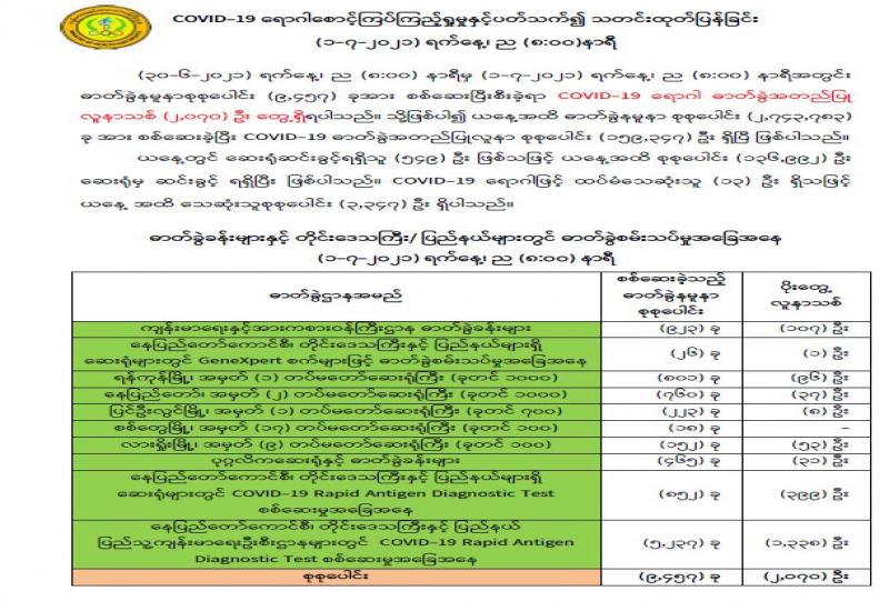 မျိုးရိုးဗီဇပြောင်း ကိုဗစ်-၁၉ ရောဂါပိုး ကူးစက်ပျံ့နှံ့လာခြင်းနှင့်အတူ ဓာတ်ခွဲအတည်ပြု လူနာသစ်များ တွေ့ရှိမှုမှာလည်း တစ်နေ့ထက် တစ်နေ့ တိုးမြင့်လာလျက်ရှိသည်။ ကိုဗစ်-၁၉ ကပ်ရောဂါ တတိယလှိုင်း ရိုက်ခတ်မှုအတွက် ရောဂါကာကွယ်ထိန်းချုပ်ရေး လုပ်ငန်းများ ကိုလည်း အချိန်နှင့်တစ်ပြေးညီ ဆောင်ရွက်လျက်ရှိသည်။ ရောဂါကူးစက်မှုနှုန်း မြင့်မားသည့် မြို့နယ်များကို အိမ်တွင်သာ နေထိုင်မှုအစီအစဉ် (Stay at Home) သတ်မှတ်ပြီး ကာကွယ်ထိန်းချုပ် လျက်ရှိရာ ရောဂါကူးစက်ပြန့်ပွားမှု ပိုမိုများပြားလာသည်နှင့်အမျှ အသွားအလာ အကူးအသန်းတို့ကို ထပ်မံကန့်သတ်တားဆီးသွား ရမည်ဖြစ်သည်။