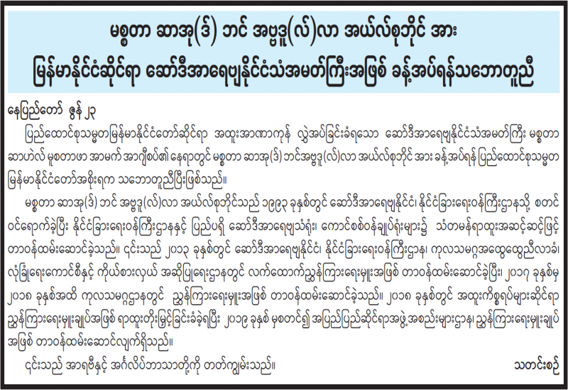 တိုင်းဒေသကြီး/ ပြည်နယ်များရှိမြို့နယ်အချို့၌ အေးချမ်းစွာနေထိုင်လိုသည့်ပြည်သူလူထုများ က ၎င်းတို့၏ သဘောဆန္ဒအလျောက် လက်လုပ်သေနတ်များနှင့် ဆက်စပ်ပစ္စည်းများအား အုပ်ချုပ်ရေး တာဝန်ရှိသူများမှတစ်ဆင့် လုံခြုံရေးတပ်ဖွဲ့ဝင်များထံ လာရောက်အပ်နှံလျက်ရှိရာ ယနေ့တွင် ဧရာဝတီတိုင်း ဒေသကြီး၊ ကျုံပျော်မြို့နယ်အတွင်းရှိ ကျေးရွာအုပ်စုများမှ လက်လုပ်သေနတ် ၁၈ လက်၊ ဒူးလေး ၄ လက်နှင့် အခြားဆက်စပ်ပစ္စည်းများအားလည်းကောင်း၊ ချင်းပြည်နယ်၊ မတူပီမြို့နယ် အတွင်းရှိ ကျေးရွာအုပ်စုများမှ တူမီးသေနတ် ၅ လက်နှင့် နှစ်လုံးပြူးသေနတ် ၁ လက်တို့အား လည်းကောင်း ကျေးရွာအုပ်ချုပ်ရေး တာဝန်ရှိသူများမှတစ်ဆင့် လုံခြုံရေးတပ်ဖွဲ့ဝင်များထံ လာရောက် အပ်နှံခဲ့ကြောင်း သိရသည်။