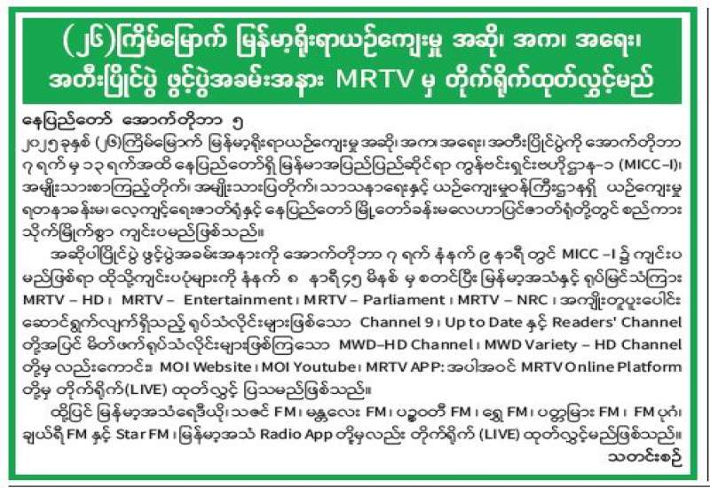 (၂၆) ကြိမ်မြောက် မြန်မာ့ရိုးရာယဉ်ကျေးမှု အဆို၊ အက၊ အရေး၊ အတီးပြိုင်ပွဲ ဖွင့်ပွဲအခမ်းအနား MRTV မှ တိုက်ရိုက်ထုတ်လွှင့်မည်
