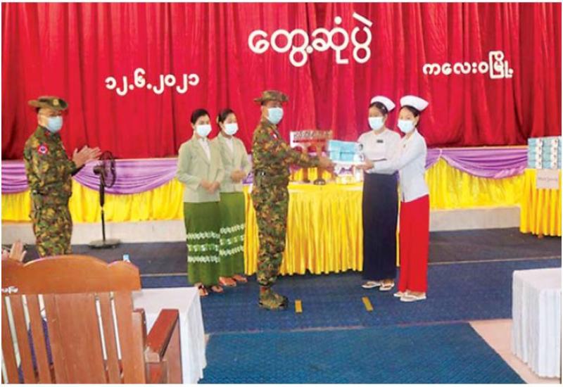 စစ်ကိုင်းတိုင်းဒေသကြီး ကလေးမြို့ရှိ ဌာနဆိုင်ရာဝန်ထမ်းများနှင့် ဒေသခံပြည်သူများအား ဇွန် ၁၂ ရက်တွင် ကာကွယ်ရေးဦးစီးချုပ်ရုံး(ကြည်း)မှ ဒုတိယဗိုလ်ချုပ်ကြီး ဖုန်းမြတ်နှင့် အဖွဲ့ဝင်များက ကလေးဝမြို့နယ်ခန်းမ၌ တွေ့ဆုံ၍ ကြက်ဥအလုံး ၅၀၀၊ ကုလားပဲ ပိဿာ ၅၀၊ ရွှေဖီဦး လက်ဖက် ခြောက်ထုပ်အထုပ် ၅၀၊ စားသောက် ဖွယ်ရာများနှင့် နှာခေါင်းစည်းအခု ၅၀၀၀ တို့ကို ပေးအပ်ရာ ကလေးဝမြို့နယ် စီမံအုပ်ချုပ်ရေးအဖွဲ့ ဥက္ကဋ္ဌ ဦးဇော်မိုးအောင်နှင့် ဒေသခံပြည်သူများက လက်ခံရယူကြသည်။