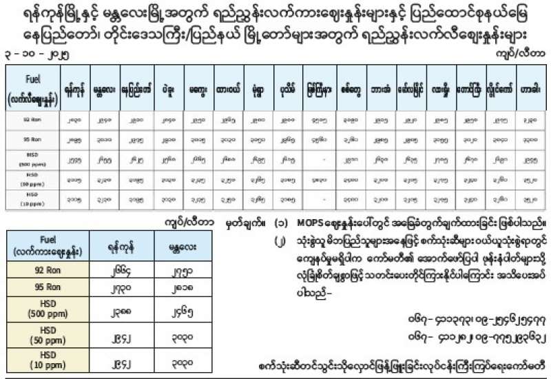 ရန်ကုန်မြို့နှင့် မန္တလေးမြို့အတွက် ရည်ညွှန်းလက်ကားဈေးနှုန်းများနှင့် ပြည်ထောင်စုနယ်မြေ နေပြည်တော်၊ တိုင်းဒေသကြီး/ပြည်နယ် မြို့တော်များအတွက် ရည်ညွှန်းလက်လီစျေးနှုန်းများ