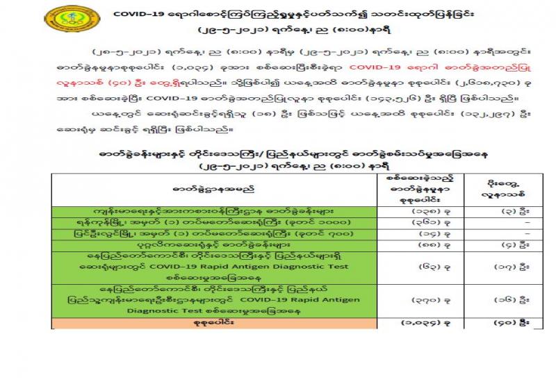 ကျန်းမာရေးနှင့် အားကစားဝန်ကြီးဌာနက မေလ၂၆ ရက်နေ့ ည ၈ နာရီမှ မေလ ၂၇ ရက်နေ့ည ၈ နာရီအတွင်း တစ်ရက်တာ ဓာတ်ခွဲနမူနှာ စုစုပေါင်း ၁၇၈၈ ခုအား စစ်ဆေးပြီးစီးမှုအရ ကိုဗစ်-၁၉ ရောဂါ ဓာတ်ခွဲအတည်ပြု လူနာသစ် ၉၆ ဦး တွေ့ရှိခဲ့ရသည်။ မေလ ၂၇ ရက်နေ့ ည ၈ နာရီမှ ၂၈ ရက်နေ့ ည ၈ နာရီအတွင်း တစ်ရက်တာ ဓာတ်ခွဲနမူနာ ၁၂၃၀ ကို စစ်ဆေးမှုအရ ရောဂါကူးစက်ခံရသူ ၇၂ ဦး ထပ်မံတွေ့ရှိခဲ့သည်။