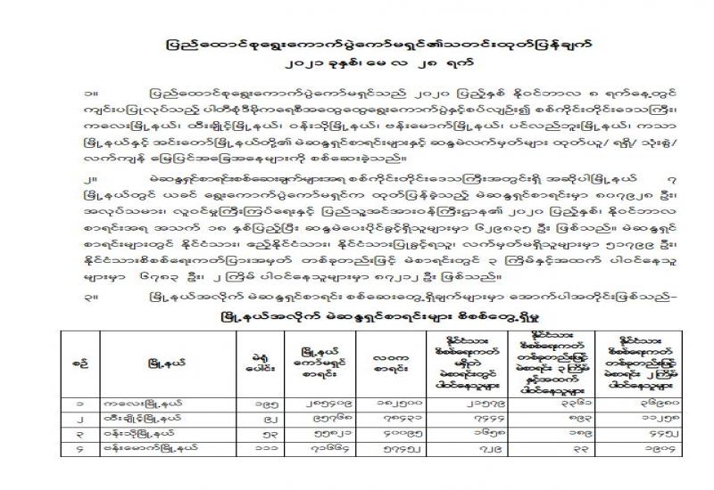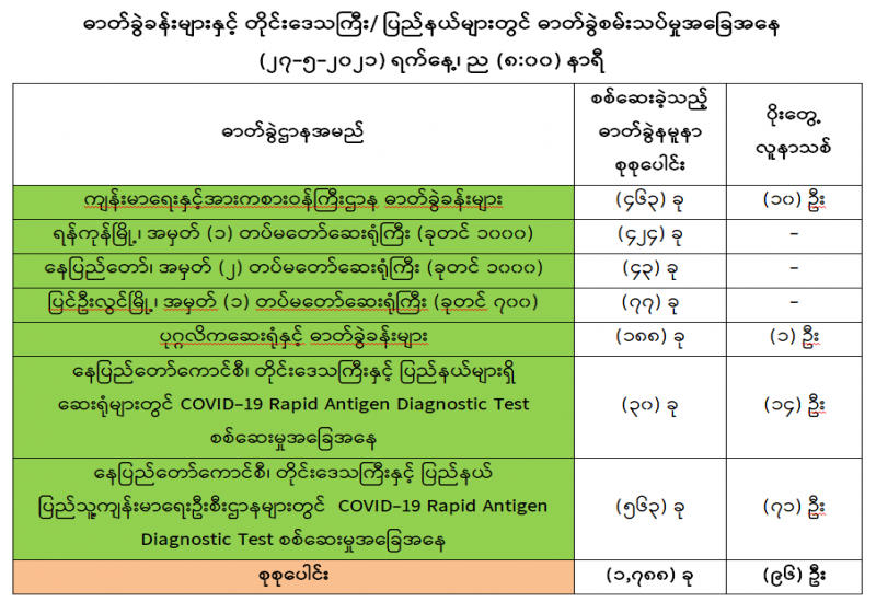 (၂၆-၅-၂၀၂၁) ရက်နေ့၊ ည (၈:၀၀) နာရီမှ (၂၇-၅-၂၀၂၁) ရက်နေ့၊ ည (၈:၀၀) နာရီအတွင်း ဓာတ်ခွဲနမူနာစုစုပေါင်း (၁,၇၈၈) ခုအား စစ်ဆေးပြီးစီးခဲ့ရာ COVID-19 ရောဂါ ဓာတ်ခွဲအတည်ပြု လူနာသစ် (၉၆) ဦး တွေ့ရှိရပါသည်။ သို့ဖြစ်ပါ၍ ယနေ့အထိ ဓာတ်ခွဲနမူနာ စုစုပေါင်း (၂,၆၁၆,၄၆၆) ခု အား စစ်ဆေးခဲ့ပြီး COVID-19 ဓာတ်ခွဲအတည်ပြုလူနာ စုစုပေါင်း (၁၄၃,၄၁၄) ဦး ရှိပြီ ဖြစ်ပါသည်။
