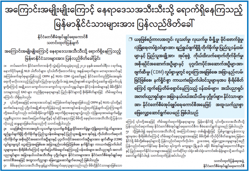 နိုင်ငံတော်စီမံအုပ်ချုပ်ရေးကောင်စီအနေဖြင့် နိုင်ငံတော်အတွင်း တည်ငြိမ် အေးချမ်းရေးနှင့် လူမှုစီးပွားဘဝဖွံ့ဖြိုးတိုးတက်ရေးတို့အတွက် ဘက်ပေါင်းစုံမှ ကြိုးပမ်းဆောင်ရွက်လျက်ရှိပြီး မိဘပြည်သူများ၏ ခရီးသွားလာမှုများနှင့် ကုန်စည်စီးဆင်းမှုများ လွယ်ကူချောမွေ့စေရန် လမ်းပန်းဆက်သွယ်ရေးတွင် အဓိကကျသည့် မီးရထားခရီးစဉ်များကို နေ့စဉ်တိုးချဲ့ပြေးဆွဲပေးလျက်ရှိကာ ခရီးသွား ပြည်သူလူထုအနေဖြင့်လည်း စိတ်ချမ်းမြေ့စွာသွားလာလျက်ရှိသည်။ ထို့အပြင် တစ်နိုင်ငံလုံး လိုလားတောင့်တလျက်ရှိသော ထာဝရငြိမ်းချမ်းရေးကို အကောင်အထည်ဖော်နိုင်ရန် လျှောက်လှမ်းလျက်ရှိသည့် တစ်နိုင်ငံလုံးပစ်ခတ် တိုက်ခိုက်မှု ရပ်စဲရေးသဘောတူစာချုပ် NCA ပါ အချက်များကို ဆက်လက် ထိန်းသိမ်း၍ အလေးထားလိုက်နာဆောင်ရွက်လျက်ရှိသည်။