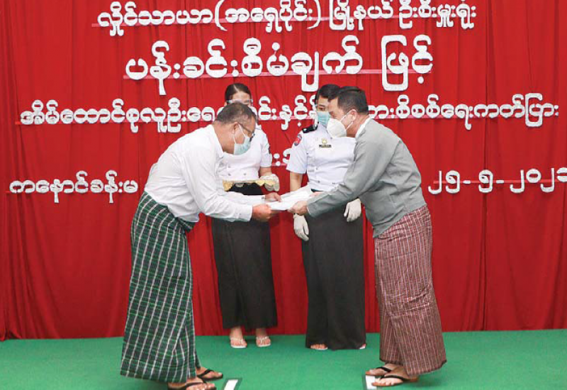 အလုပ်သမား၊ လူဝင်မှုကြီးကြပ်ရေးနှင့် ပြည်သူ့ အင်အားဝန်ကြီးဌာန ပြည်ထောင်စုဝန်ကြီး ဦးမြင့်ကြိုင်သည် ရန်ကုန်တိုင်းဒေသကြီး၊ စီမံအုပ်ချုပ် ရေးကောင်စီဥက္ကဋ္ဌ ဦးလှစိုးနှင့်အတူ ယမန်နေ့ညနေ ၄ နာရီခွဲတွင် လှိုင်သာယာ(အရှေ့ပိုင်း)မြို့နယ်၊ လှိုင်သာယာစက်မှုဇုန် ကနောင်ခန်းမရှေ့၌ လှိုင်သာယာ(အရှေ့ပိုင်း) မြို့နယ်ဦးစီးမှူးရုံး ဝန်ထမ်းများက ဒေသခံပြည်သူများကို ပန်းခင်းစီမံချက်ဖြင့် အိမ်ထောင်စုလူဦးရေစာရင်းနှင့် နိုင်ငံသားစိစစ်ရေး ကတ်ပြားထုတ်ပေးရေးလုပ်ငန်း ကွင်းဆင်း ဆောင်ရွက်နေမှုကို လှည့်လည်ကြည့်ရှု အားပေးကာ အထောက်အထား အပြည့်အစုံဖြင့် လာရောက် လျှောက်ထားသူများကို နေ့ချင်းပြီးဆောင်ရွက်သည့် နိုင်ငံသားစိစစ်ရေးကတ်ပြား (၆၀) ကို ကာယကံရှင် တစ်ဦးချင်းထံ ပေးအပ်သည်။