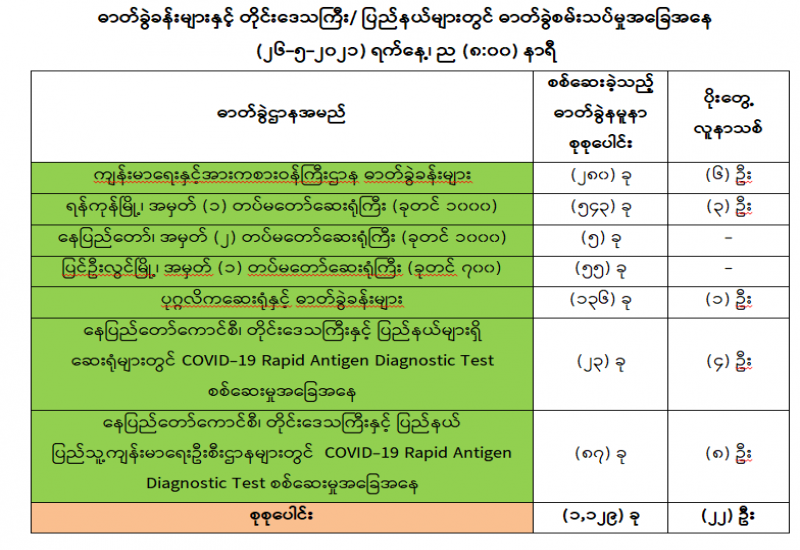 (၂၅-၅-၂၀၂၁) ရက်နေ့၊ ည (၈:၀၀) နာရီမှ (၂၆-၅-၂၀၂၁) ရက်နေ့၊ ည (၈:၀၀) နာရီအတွင်း ဓာတ်ခွဲနမူနာစုစုပေါင်း (၁,၁၂၉) ခုအား စစ်ဆေးပြီးစီးခဲ့ရာ COVID-19 ရောဂါ ဓာတ်ခွဲအတည်ပြု လူနာသစ် (၂၂) ဦး တွေ့ရှိရပါသည်။ သို့ဖြစ်ပါ၍ ယနေ့အထိ ဓာတ်ခွဲနမူနာ စုစုပေါင်း (၂,၆၁၄,၆၇၈) ခု အား စစ်ဆေးခဲ့ပြီး COVID-19 ဓာတ်ခွဲအတည်ပြုလူနာ စုစုပေါင်း (၁၄၃,၃၁၈) ဦး ရှိပြီ ဖြစ်ပါသည်။