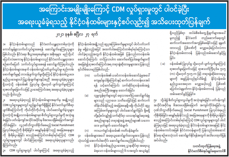 တိုင်းဒေသကြီးနှင့်ပြည်နယ်အချို့တွင် CDM လှုပ်ရှားမှုကို အခြေခံပြီး ရပ်ရွာ အေးချမ်းသာယာရေးနှင့် တရားဥပဒေစိုးမိုးမှုအား ပျက်ပြားစေရန် ရည်ရွယ်ချက်ဖြင့် အကြမ်းဖက်မှုများကို ဦးတည်စေသော ဆူပူဆန္ဒပြမှုများအား သွေးထိုးလှုံ့ဆော် လျက်ရှိသောကြောင့် အုပ်ချုပ်ရေးအဖွဲ့အစည်းများနှင့် လုံခြုံရေးအဖွဲ့အစည်းများက ဥပဒေနှင့်အညီ ပူးပေါင်းထိန်းသိမ်းဆောင်ရွက်လျက်ရှိသည်။