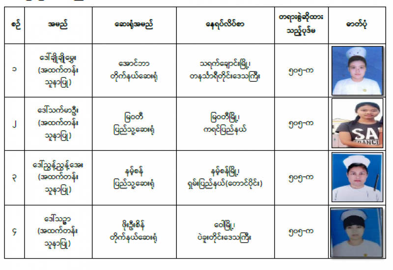နိုင်ငံတော်၏အုပ်ချုပ်မှုယန္တရားပျက်ပြားစေရန် ရည်ရွယ်ချက်ဖြင့် နိုင်ငံ့ဝန်ထမ်းများနှင့် ကျန်းမာရေးဝန်ထမ်းများအား CDM လှုပ်ရှားမှုများတွင် ပါဝင်လာစေရန် လှုံ့ဆော်ခြင်း၊ ၎င်းတို့ကိုယ်တိုင် CDM လှုပ်ရှားမှုများတွင် ပါဝင်လုပ်ဆောင်ခြင်း၊ CDM လှုပ်ရှားမှု အပေါ် ထောက်ခံအားပေးခြင်း၊ အကြမ်းဖက်အုပ်စုများအဖြစ် သတ်မှတ်ကြေညာထားသည့် CRPH နှင့် NUG တို့အား ထောက်ခံအားပေးခြင်းတို့ကို ဆောင်ရွက်လျက်ရှိသည့် အောက်ဖော် ပြပါ သူနာပြုများအား ရာဇသတ်ကြီးပုဒ်မ ၅၀၅-က ဖြင့် အမှုဖွင့်အရေးယူဆောင်ရွက် ထားပြီးဖြစ်ပါသည်-