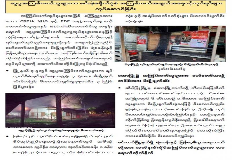 မန္တလေးတိုင်းဒေသကြီး စဉ့်ကိုင်မြို့နယ်ရှိ ရေနံနှင့် သဘာဝဓာတ်ငွေ့စက်ရုံ၌ လုံခြုံရေး ဆောင်ရွက်နေသည့် တပ်ဖွဲ့ဝင်များအား မေ ၅ ရက်တွင် အကြမ်းဖက် သူများက အကြောင်းမဲ့ ဝင်ရောက် အကြမ်းဖက်ရန်ပြုတိုက်ခိုက်မှူကြောင့် လုံခြုံရေး တပ်ဖွဲ့ဝင် ၃ ဦး ထိခိုက်ဒဏ်ရာ ရရှိကာ ကျဆုံးခဲ့သည့် သတင်းအား ထုတ်ပြန်ခဲ့ပြီး ဖြစ်ပါသည်။