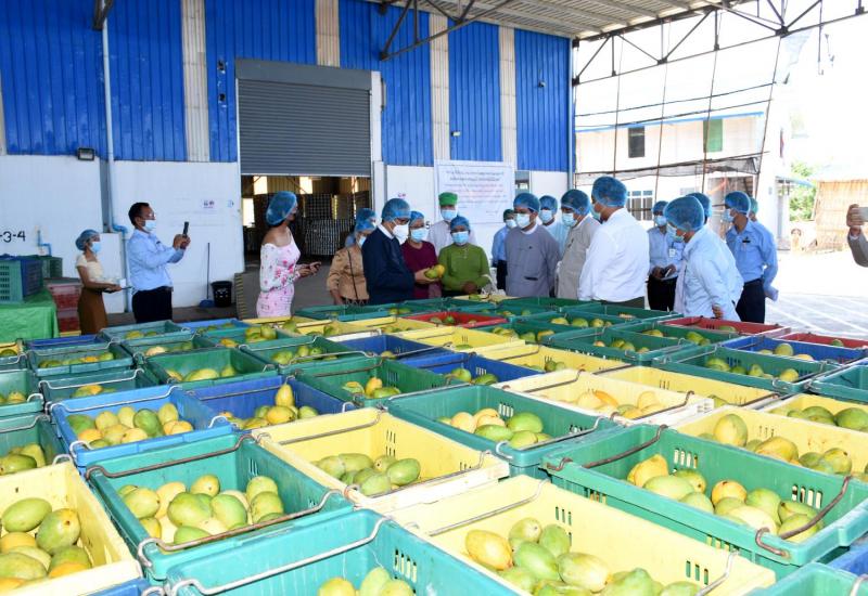 စီးပွားရေးနှင့် ကူးသန်းရောင်းဝယ်ရေးဝန်ကြီးဌာန ပြည်ထောင်စုဝန်ကြီး ဒေါက်တာ ပွင့်ဆန်းနှင့် စိုက်ပျိုးရေး၊ မွေးမြူရေးနှင့် ဆည်မြောင်းဝန်ကြီးဌာန ပြည်ထောင်စုဝန်ကြီး ဦးတင်ထွဋ်ဦး တို့သည် ယနေ့နံနက်ပိုင်းတွင် နေပြည်တော်၊ ဒက္ခိဏသီရိစက်မှုဇုန်၊ မဉ္ဇူသက လမ်းရှိ MYANMAR GOLDEN PRODUCE CO., LTD ၏ သစ်သီးဝလံ တန်ဖိုးမြှင့် ထုတ်လုပ်သည့် စက်ရုံကို ကြည့်ရှုစစ်ဆေးသည်။