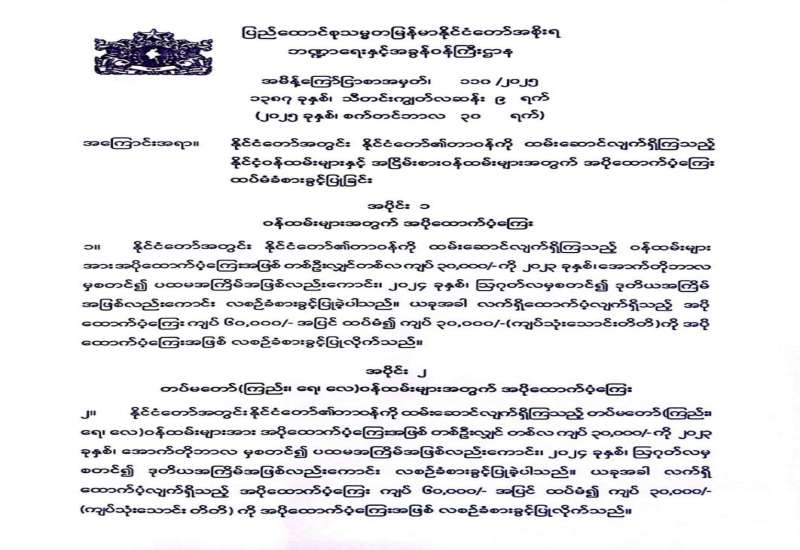 နိုင်ငံတော်အတွင်း နိုင်ငံတော်၏တာဝန်ကို ထမ်းဆောင်လျက်ရှိကြသည့် နိုင်ငံ့ဝန်ထမ်းများနှင့် အငြိမ်းစားဝန်ထမ်းများအတွက် အပိုထောက်ပံ့ကြေး ထပ်မံခံစားခွင့်ပြုခြင်း