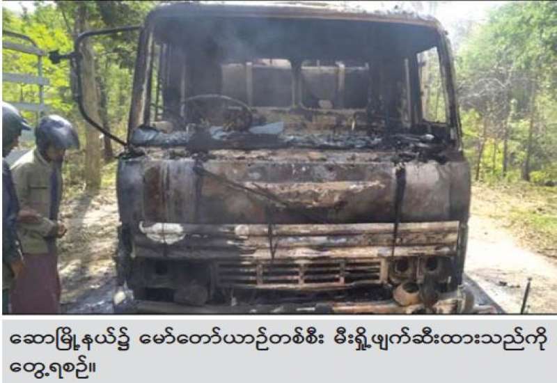 မကွေးတိုင်းဒေသကြီး၊ ဆောမြို့နယ်၌ မေ ၁၃ ရက်တွင် အကြမ်းဖက်သူများက မီးရှို့ဖျက်ဆီး၍ မော်တော်ယာဉ် ၁ စီးမီးလောင်ပျက်စီးကာ ယာဉ်မောင်းနှင့် ယာဉ်နောက် လိုက်တို့ သေဆုံး ခဲ့ကြောင်း သိရသည်။