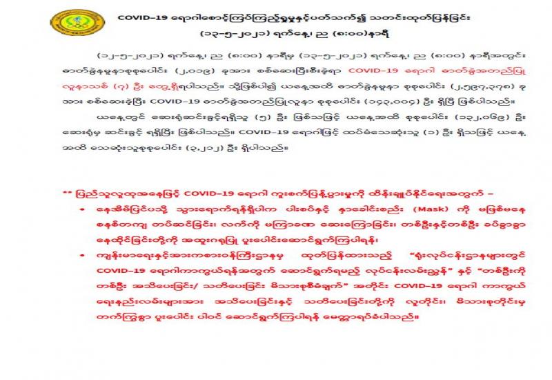 နေပြည်တော်ကောင်စီဥက္ကဋ္ဌ ဒေါက်တာ မောင်မောင်နိုင်သည် နေပြည်တော်ကောင်စီဝင် များဖြစ်ကြသည့် ဗိုလ်မှူးကြီးမင်းနောင်၊ ဦးဇေယျာလင်းနှင့် ဦးမြင့်စိုး၊ တာဝန်ရှိသူများနှင့် အတူ ယနေ့နံနက်ပိုင်းတွင် နေပြည်တော် တပ်ကုန်းမြို့နယ်အတွင်းရှိ အခြေခံပညာကျောင်း များဖြစ်ကြသော အထက(၈)၊အထက(၄)၊ အထက(၁)၊အထက(၂)နှင့် အထက(ခွဲ)ဗိုလ်မင်း ရောင်၊ ဇေယျာသီရိမြို့နယ်အတွင်းရှိ အထက(ပြည်စံအောင်)နှင့် အထက(ကျောက်ချက်)တို့ ပြန်လည်ဖွင့်လှစ်သင်ကြားနိုင်ရေးနှင့် တပ်ကုန်းမြို့နယ် ပြည်သူ့ဆေးရုံ(ခုတင် ၁၀၀)တွင် ပြည်သူများအား ကျန်းမာရေးစောင့်ရှောက်ပေးနေမှု အခြေအနေများကို ကြည့်ရှု စစ်ဆေးသည်။