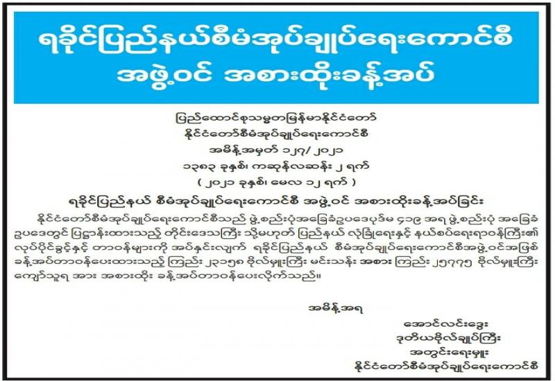 နိုင်ငံပိုင်ရုပ်ရှင်ရုံ တောင်ကြီး (မြသုခ)၊ လားရှိုး(အောင်သီရိ)တို့၏တာဝန်နှင့်ဝတ္တရားလွှဲပြောင်းခြင်း စာချုပ် ချုပ်ဆိုခြင်းကို မေ ၁၂ ရက် မွန်းလွဲ ၂ နာရီက တောင်ကြီးမြို့ ရှမ်းပြည်နယ် စီမံ အုပ်ချုပ်ရေးကောင်စီရုံး အစည်းအဝေးခန်းမ၌ ကျင်းပသည်။