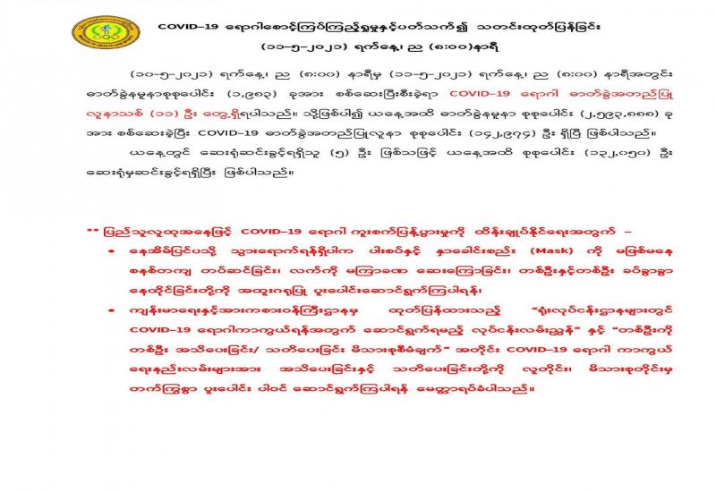 ယနေ့နံနက်(၀၉:၃၀)နာရီအချိန်ထိမိုးလေဝသတိုင်းထွာချက်အကျဉ်းချုပ်။ လွန်ခဲ့သော(၂၄)နာရီအတွင်းက စစ်ကိုင်းတိုင်းဒေသကြီးအောက်ပိုင်းနှင့် ဧရာဝတီ တိုင်းဒေသကြီးတို့တွင် တိမ်အသင့်အတင့် ဖြစ်ထွန်းခဲ့ပြီး၊ ရှမ်းပြည်နယ်တွင် နေရာအနှံ့အပြား၊ နေပြည်တော်နှင့် ကယားပြည်နယ်တို့တွင် နေရာစိပ်စိပ်၊ စစ်ကိုင်းတိုင်းဒေသကြီးအထက်ပိုင်း၊ မန္တလေးတိုင်းဒေသကြီး၊ မကွေးတိုင်းဒေသကြီး၊ ကချင်ပြည်နယ်၊ ကရင်ပြည်နယ်နှင့် မွန်ပြည်နယ်တို့တွင် နေရာကျဲကျဲ နှင့် ကျန်တိုင်းဒေသကြီးနှင့် ပြည်နယ်တို့တွင် နေရာကွက်ကျား မိုးထစ်ချုန်းရွာခဲ့ပါသည်။