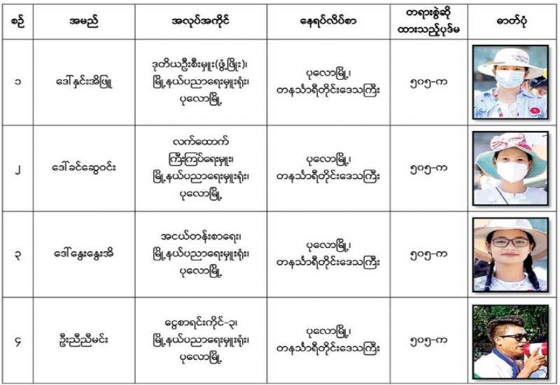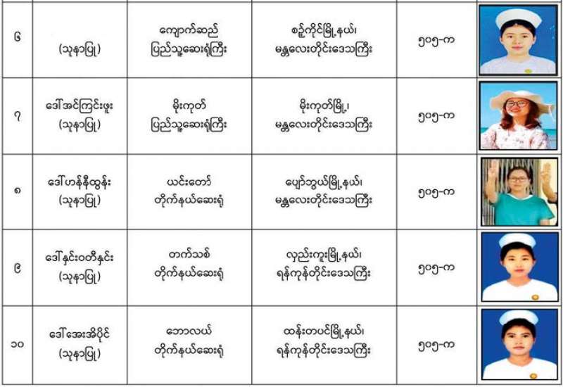 နိုင်ငံတော်၏ အုပ်ချုပ်မှုယန္တရားပျက်ပြားစေရန် ရည်ရွယ်ချက်ဖြင့် နိုင်ငံ့ဝန်ထမ်းနှင့် ကျန်းမာရေး ဝန်ထမ်းများအား CDM လှုပ်ရှားမှုများတွင် ပါဝင်လာစေရန် လှုံ့ဆော်ခြင်း၊ ၎င်းတို့ကိုယ်တိုင် CDM လှုပ်ရှားမှုများတွင် ပါဝင် လုပ်ဆောင် ခြင်း၊ CDM လှုပ်ရှားမှုအပေါ် ထောက်ခံအားပေးခြင်း၊ CRPH မတရား အသင်းအား ထောက်ခံ အားပေးခြင်း တို့ကို ဆောင်ရွက် လျက်ရှိသည့် အောက်ဖော်ပြပါ သူနာပြုများအား ရာဇသတ်ကြီးပုဒ်မ ၅၀၅-က ဖြင့် အမှုဖွင့် အရေး ယူဆောင်ရွက်ထားပြီး ဖြစ်ပါသည်။
