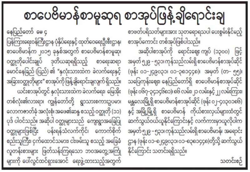 ပညာရေးဝန်ကြီးဌာန အဆင့်မြင့်ပညာကဏ္ဍ (ဝိဇ္ဇာ သိပ္ပံတက္ကသိုလ်များ၊ ပညာရေးဒီဂရီ ကောလိပ်များ) ဘဏ္ဍာရေးဆိုင်ရာစီမံ ခန့်ခွဲကြီးကြပ်မှုမွမ်းမံသင်တန်းကို ယနေ့နံနက် ၉ နာရီတွင် နေပြည်တော်ရှိ ပညာရေးဝန်ကြီးဌာန ရုံးအမှတ်(၁၃) အစည်းအဝေး ခန်းမ၌ကျင်းပသည်။