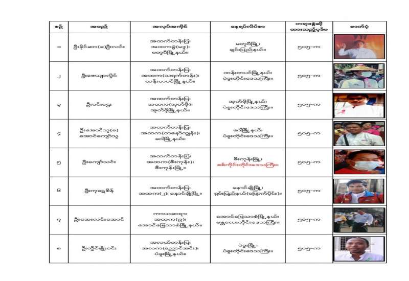 နိုင်ငံတော်၏ အုပ်ချုပ်မှုယန္တရားပျက်ပြားစေရန် ရည်ရွယ်ချက်ဖြင့် နိုင်ငံ့ဝန်ထမ်းနှင့် ကျန်းမာရေးဝန်ထမ်းများအား CDM လှုပ်ရှားမှုများတွင် ပါဝင်လာစေရန် လှုံ့ဆော်ခြင်း၊ ၎င်းတို့ကိုယ်တိုင် CDM လှုပ်ရှားမှုများတွင် ပါဝင် လုပ်ဆောင်ခြင်း၊ CDM လှုပ်ရှားမှု အပေါ် ထောက်ခံအားပေးခြင်း၊ CRPH မတရားအသင်းအား ထောက်ခံ အားပေးခြင်း တို့ကို ဆောင်ရွက်လျက်ရှိသည့် အောက်ဖော်ပြပါ ဆရာဝန်များအား ရာဇသတ်ကြီးပုဒ်မ ၅၀၅-က ဖြင့် အမှုဖွင့်အရေး ယူဆောင်ရွက် ထားပြီးဖြစ်ပါသည်။