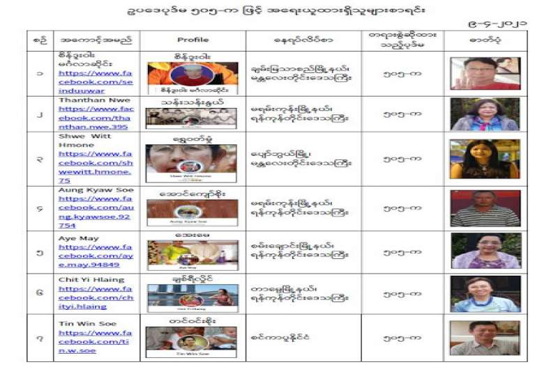 နိုင်ငံတော်၏ အုပ်ချုပ်မှုယန္တရားပျက်ပြားစေရန်ရည်ရွက်ချက်ဖြင့် နိုင်ငံ့ဝန်ထမ်းများအား CDM လှုပ်ရှားမှုတွင် ပါဝင်စေရန်လှုံ့ဆော်ခြင်း၊ CRPH မတရားအသင်းအား ထောက်ခံသည့် အကြောင်းအရာများ၊ မမှန်သတင်းများ အားဖြန့်ဝေခြင်း၊ နိုင်ငံတော်တည်ငြိမ်အေးချမ်းမှုကို ပျက်ပြားစေပြီး ဆူပူအုံကြွမှုဖြစ်ပေါ်စေရန်နှင့် အများပြည်သူ အထိတ်တလန့်ဖြစ်စေရန် အတွက် သွေးထိုးလှုံ့ဆော်မှုများပြုလုပ်ခြင်း၊ Social Pumishment ပြုလုပ်ခြင်းများကို လူမှုကွန်ရက် စာမျက်နှာများတွင် ရည်ရွယ်ချက်ရှိရှိ ဖြင့်ဖော်ပြခြင်းနှင့် ဖြန့်ဝေခြင်းများ ဆောင်ရွက် လျက်ရှိသည့် အောက်ဖော်ပြပါ အနုပညာရှင်အချို့နှင့် အခြားပါဝင်ပတ်သက်သူများအား ရာဇသတ်ကြီးပုဒ်မ ၅၀၅-က ဖြင့် အမှုဖွင့်အရေးယူ ဆောင်ရွက်လျက်ရှိပါသည်။