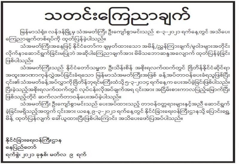 (၂၀၂၁ ခုနှစ်၊ မတ်လ (၁၀)ရက်နေ့ မွန်းလွဲ (၂:၀၀)နာရီအချိန် ထုတ်ပြန်ချက်)