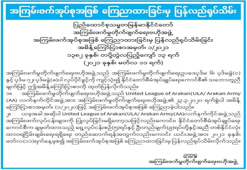နိုင်ငံတော်စီမံအုပ်ချုပ်ရေးကောင်စီက နိုင်ငံတော်ကို တာဝန်ယူထားစဉ်ကာလအတွင်း ငြိမ်းချမ်းရေးလုပ်ငန်းစဉ်များကိုလည်း အရှိန်အဟုန်မပျက် ဆက်လက်ဆောင်ရွက်လျက် ရှိသည်။ နိုင်ငံတော်စီမံအုပ်ချုပ်ရေးကောင်စီ၏ ရှေ့လုပ်ငန်း -စဉ်(၅)ရပ်တွင် “ တစ်နိုင်ငံလုံး ထာဝရ ငြိမ်းချမ်းရေးရရှိစေရန်အတွက် တစ်နိုင်ငံလုံး ပစ်ခတ်တိုက်ခိုက်မှုရပ်စဲရေး သဘောတူစာချုပ် NCA ပါ သဘောတူညီချက်များအတိုင်း ဖြစ်နိုင်သမျှ အလေးထားဆောင်ရွက်သွားမည်” ဆိုသည့် လုပ်ငန်းစဉ်ကို ထည့်သွင်းချမှတ်ထားသည်။ ထို့ပြင် နိုင်ငံတော် စီမံအုပ်ချုပ်ရေးကောင်စီ၏ ဦးတည်ချက်(၉)ရပ်တွင်လည်း “တစ်နိုင်ငံလုံး ထာဝရငြိမ်းချမ်းရေးရရှိရေးအတွက် တစ်နိုင်ငံ လုံး ပစ်ခတ်တိုက်ခိုက်မှုရပ်စဲရေး သဘောတူစာချုပ် NCA ပါ အတိုင်း အလေးထားဆောင်ရွက် သွားရေး” ဆိုသည့် နိုင်ငံရေး ဦးတည်ချက်တစ်ရပ်ကို ထည့်သွင်းချမှတ်ထားသည်။