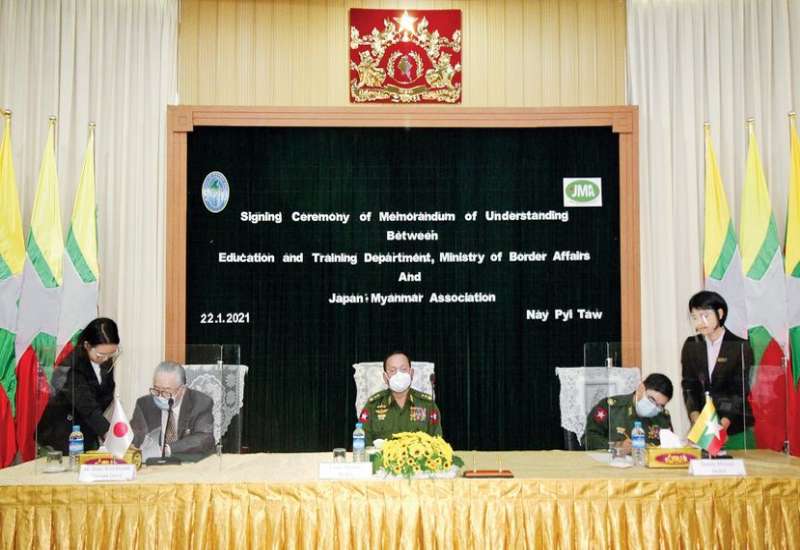 နယ်စပ်ရေးရာဝန်ကြီးဌာနနှင့် ဂျပန်-မြန်မာအသင်း (Japan-Myanmar Association-JMA) တို့အကြား နယ်စပ်ဒေသ လူ့စွမ်းအားအရင်းအမြစ် ဖွံ့ဖြိုးတိုးတက်ရေးဆိုင်ရာစီမံကိန်း နားလည်မှုစာချွန်လွှာ လက်မှတ်ရေးထိုးပွဲအခမ်းအနားကို ယနေ့ နံနက် ၁၁ နာရီခွဲတွင် နယ်စပ်ရေးရာဝန်ကြီးဌာန အစည်းအဝေးခန်းမ၌ ကျင်းပသည်။