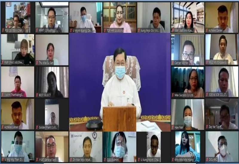 ပြည်တွင်းအလုပ်အကိုင်ဆိုင်ရာ ဝန်ဆောင်မှုလုပ်ငန်းရှင် များအသင်း၏ အလုပ်အမှု ဆောင်များ၊ ပြည်တွင်း အလုပ်အကိုင်ရှာဖွေရေး အကျိုးဆောင် အေဂျင်စီများမှ မန်နေးဂျင်း ဒါရိုက်တာများနှင့် ပြည်တွင်းအလုပ်အကိုင်များကို New Nomal နှင့်အညီ ပိုမိုလျှင်မြန် ထိရောက်စွာ ရှာဖွေပေးနိုင်ရေး ဆွေးနွေးပွဲအခမ်းအနားကို ယနေ့နံနက် ၁၀ နာရီတွင် နေပြည်တော်ရှိ အလုပ်သမား၊ လူဝင်မှုကြီးကြပ်ရေးနှင့် ပြည်သူ့အင်အားဝန်ကြီးဌာန အစည်း အဝေးခန်းမ၌ Video Conferencing စနစ်ဖြင့် ကျင်းပသည်။