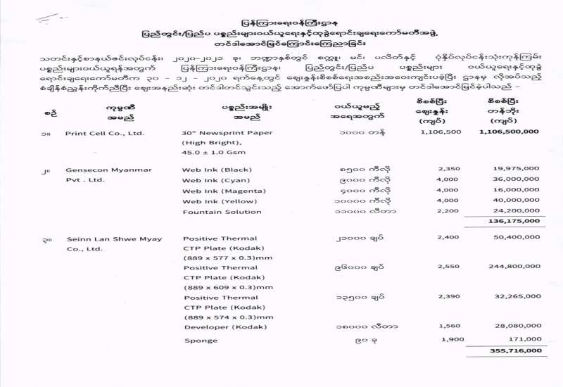 ပြန်ကြားရေးဝန်ကြီးဌာန ပြည်တွင်း/ ပြည်ပ ပစ္စည်းများ ဝယ်ယူရေးနှင့် ထုခွဲရောင်းချရေးကော်မတီ တင်ဒါအောင်မြင်ကြောင်း ကြေညာခြင်း