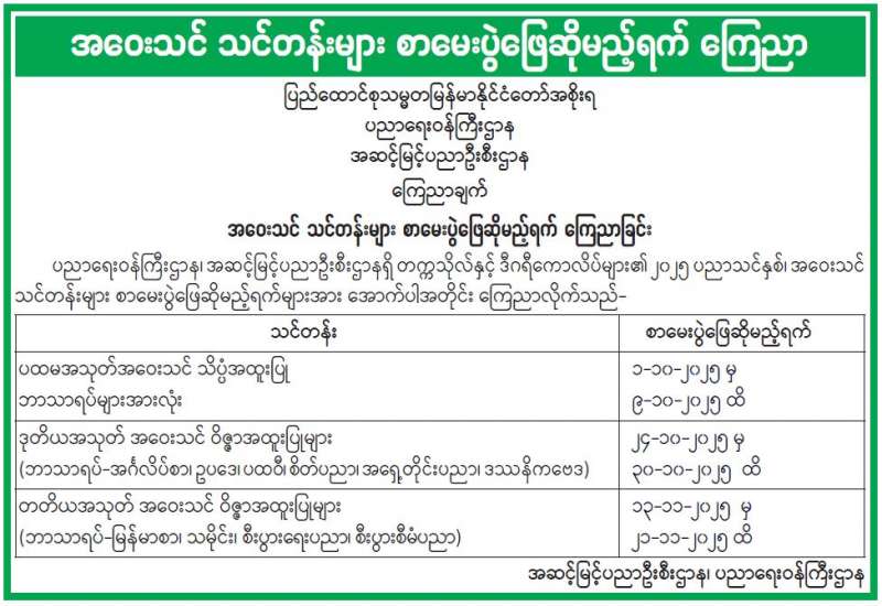 မြန်မာနိုင်ငံစာရင်းကောင်စီမှ ကြီးမှူး၍ ပြည်ထောင်စုစာရင်းစစ်ချုပ်ရုံး၊ အဆင့်မြင့်စာရင်းကိုင်နှင့် စာရင်းစစ်သင်တန်းကျောင်း၊ နေပြည်တော်တွင် ဖွင့်လှစ်သည့် နိုင်ငံတကာဘဏ္ဍာရေး အစီရင်ခံခြင်းစံများ ဒီပလိုမာသင်တန်း အမှတ်စဉ် (၁) အပိုင်း (၃) (Diplo-ma in International Financial Reporting Standards- Batch- 1, Level – III) သင်တန်းဆင်းပွဲအခမ်းအနားကို ယနေ့နံနက် ၉ နာရီခွဲတွင် နေပြည်တော်ရှိ ပြည်ထောင်စုစာရင်းစစ်ချုပ်ရုံး နဝရတ်ခန်းမ၌ Hybrid စနစ်ဖြင့် ကျင်းပသည်။