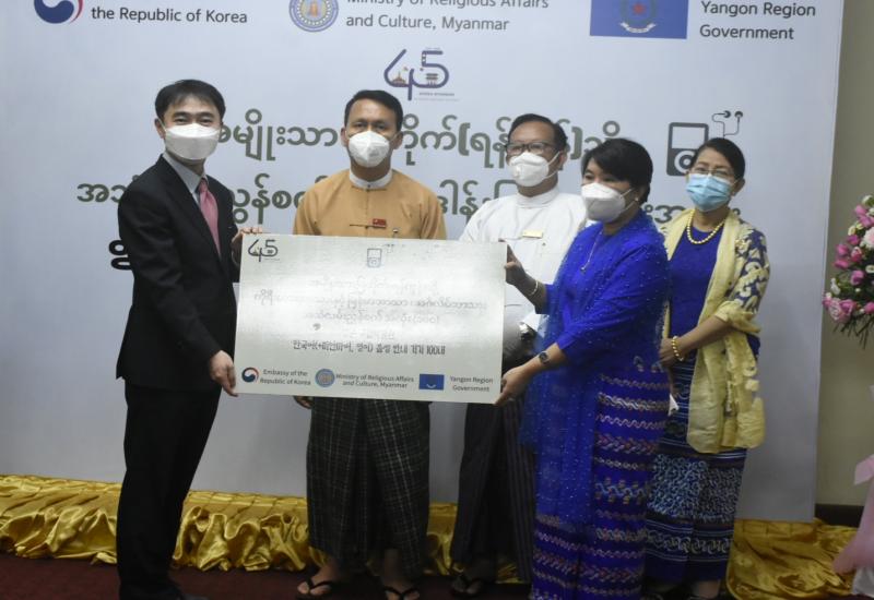 သာသနာရေးနှင့်ယဉ်ကျေးမှုဝန်ကြီးဌာန၊ အမျိုးသားပြတိုက်(ရန်ကုန်)သို့ မြန်မာနိုင်ငံဆိုင်ရာ ကိုရီးယားသမ္မတနိုင်ငံသံရုံးမှ အသံလမ်းညွှန်စက်အလုံး ၁၀၀ လှူဒါန်းခြင်းကို ဒဂုံမြို့နယ်၊ ပြည်လမ်းရှိ အဆိုပါ ပြတိုက်တွင် ယမန်နေ့ နံနက်က ကျင်းပခဲ့သည်။